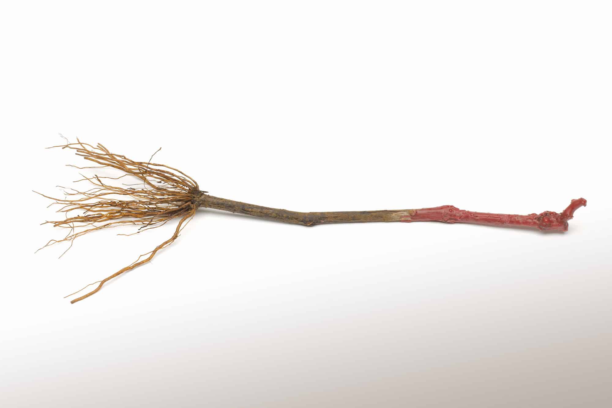 Le plant greffé de vigne est taillé à deux yeux, paraffiné (cire rouge qui ne doit pas être enlevée) et avec les racines coupées pour faciliter la plantation manuelle et mécanisée.